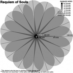 - Funktionsweise: Immer 2 Seelen aus der Necromastery bilden eine Linie für den sich kreisförmig ausbreitenden Angriff. Die Linien sind gleichmäßig angeordnet. Maximal sind also 15 Linien möglich. Alle Gegner werden verlangsamt und nehmen 80/120/160 Schaden für jeder dieser Linien. Veranschaulicht wird das Ganze durch die Grafik rechts. Dabei ist jedoch zu beachten, dass der volle Schaden nur ausgeteilt wird, wenn sich Nevermore im Kollisionsquadrat des Ziels befindet, was z.B. mit