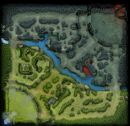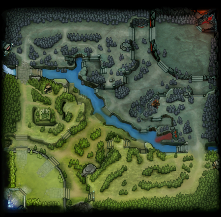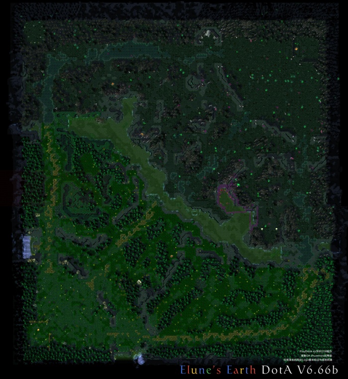 Als Map (dt. Karte) bezeichnet man das Level, in dem man spielt. Im Spiel Dota gibt es nur eine wählbare Spielkarte, jedoch in verschiedenen Versionen. In dem richtigen Spiel Warcraft gibt es verschiedene Maps wie Echo Isles, Turtle Rock, etc. Als Mini-Map bezeichnet man die kleine Übersichtskarte unten links zur Orientierung. Hier die DotA-Map (Version 6.66 b) aus der Vogelperspektive: